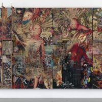 Time is fluid and malleable in Elliott Hundley’s three dimensional, mixed-media painting “the high house low!” (2011), an explosion of color and texture that sucks the viewer into a visual drama sparking with fire and rage. The four-panel assemblage work measuring more than 16